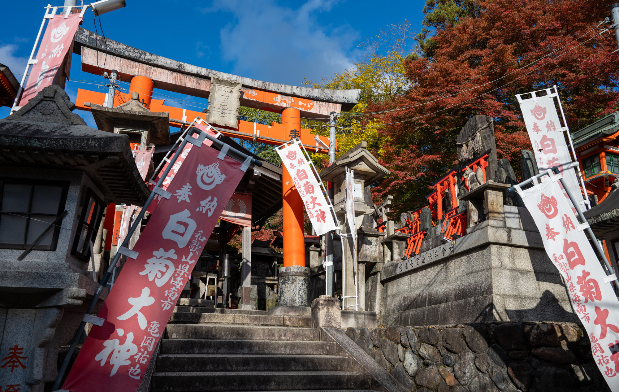 I really like the photo above with all the flags and the great colors. The sky was cooperating and I was happy to see it. You can see all the many many tori gates that liter the mountainside.